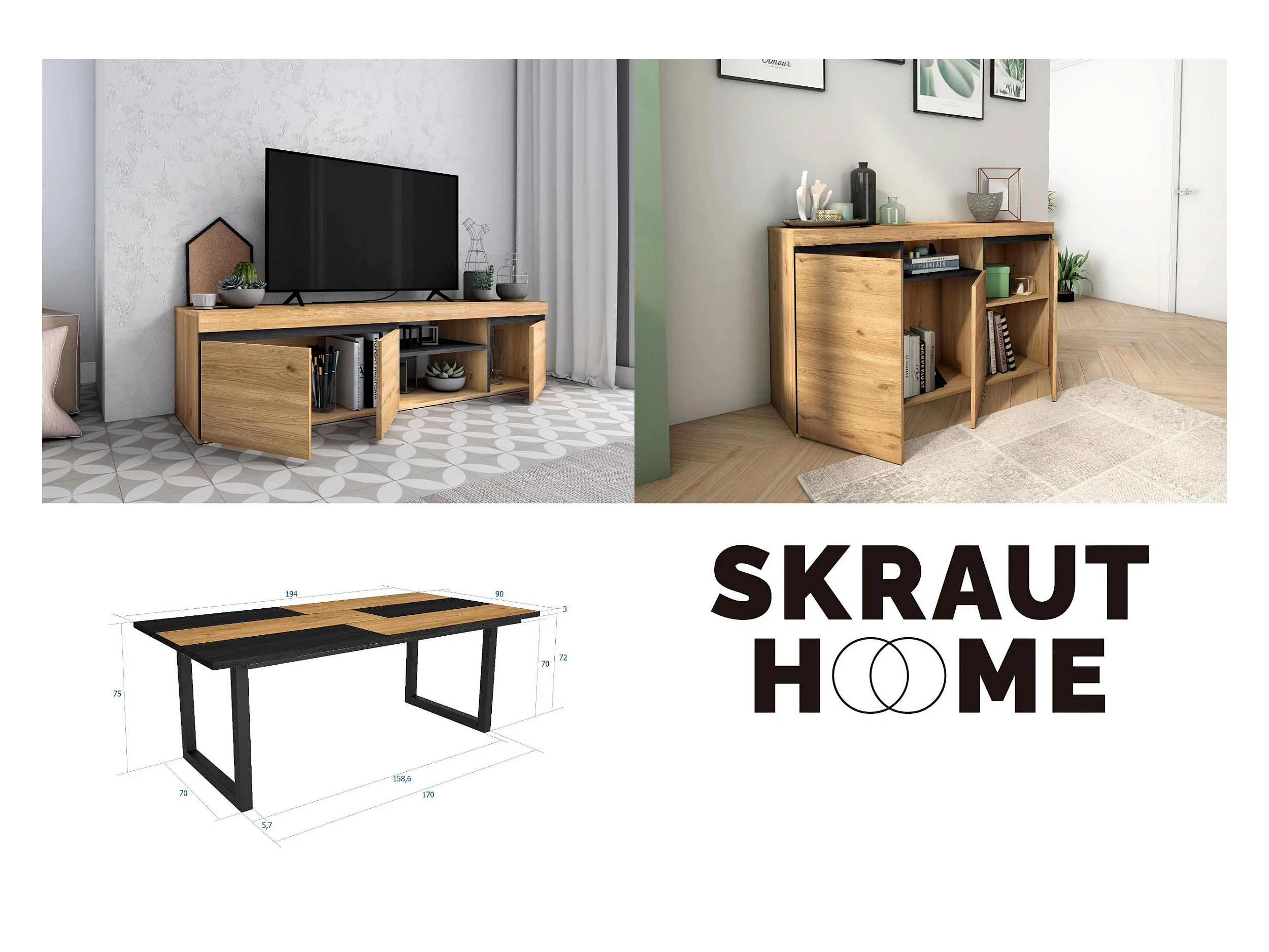 Woonkamermeubelset, Tafel 200 Bicolore Tafelpoten X 10 gasten, TV Kast 120, Sideboard / Buffetkast 140, Eiken en Zwart, Industriële