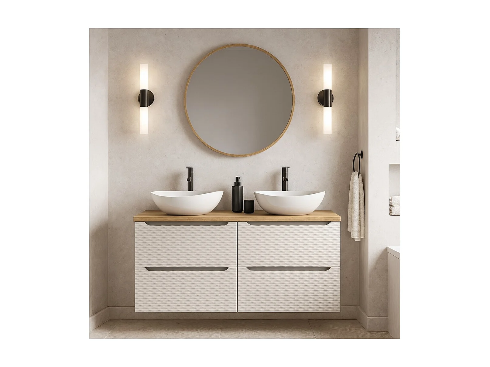 YOKA beige badkamerset: 2 onderkasten 60 cm + blad voor wastafel + 2 wastafels