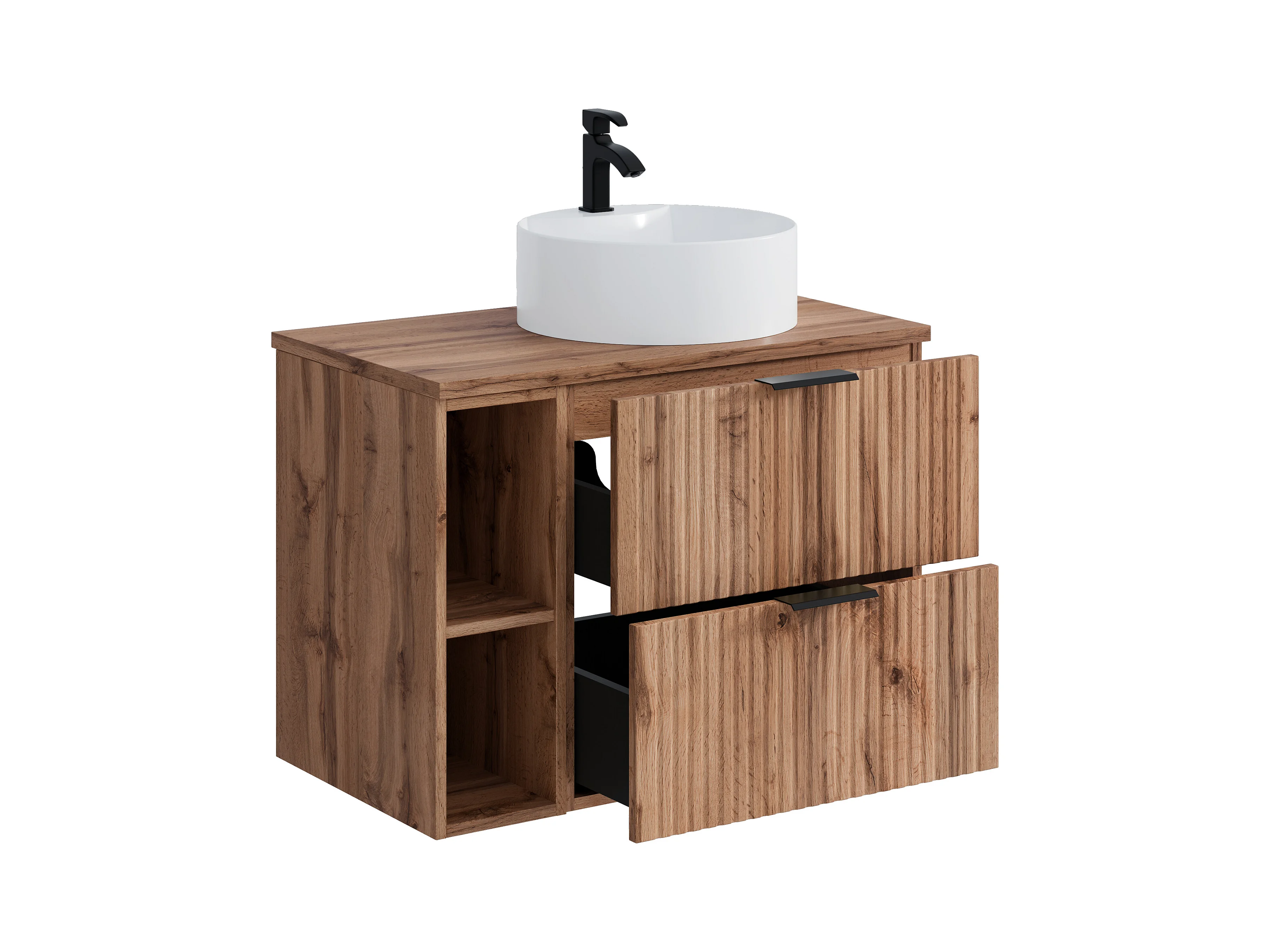 Geribbeld hangmeubel voor badkamer met nissen en ronde opbouwwastafel - Licht naturel - L80 cm - ZEVARA
