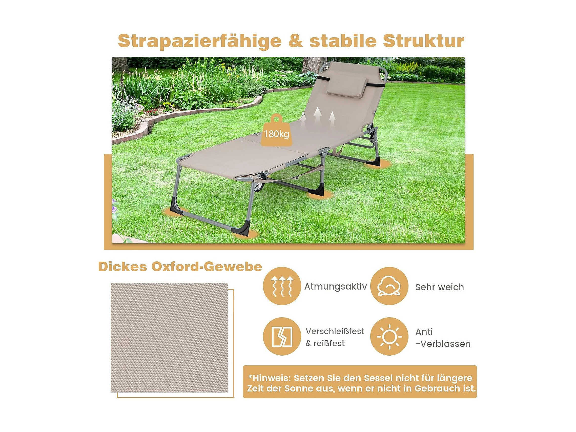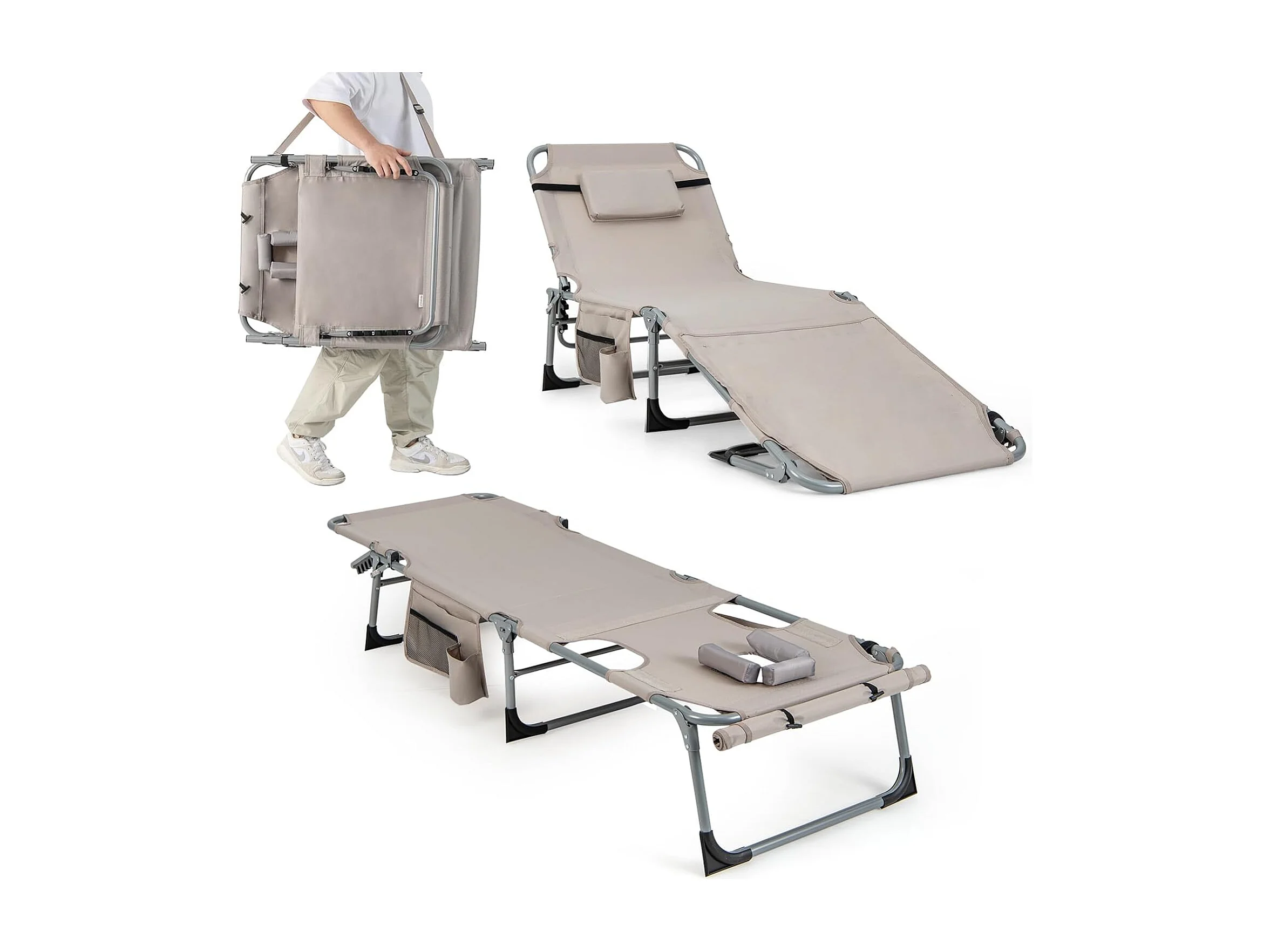 Zonneligstoel met gezichtsopening, opvouwbare ligstoel met verstelbare rugleuning en voetensteun,zijzak, ligstoel voor strand, tuin,balkon, zandkleurig, ZB33480