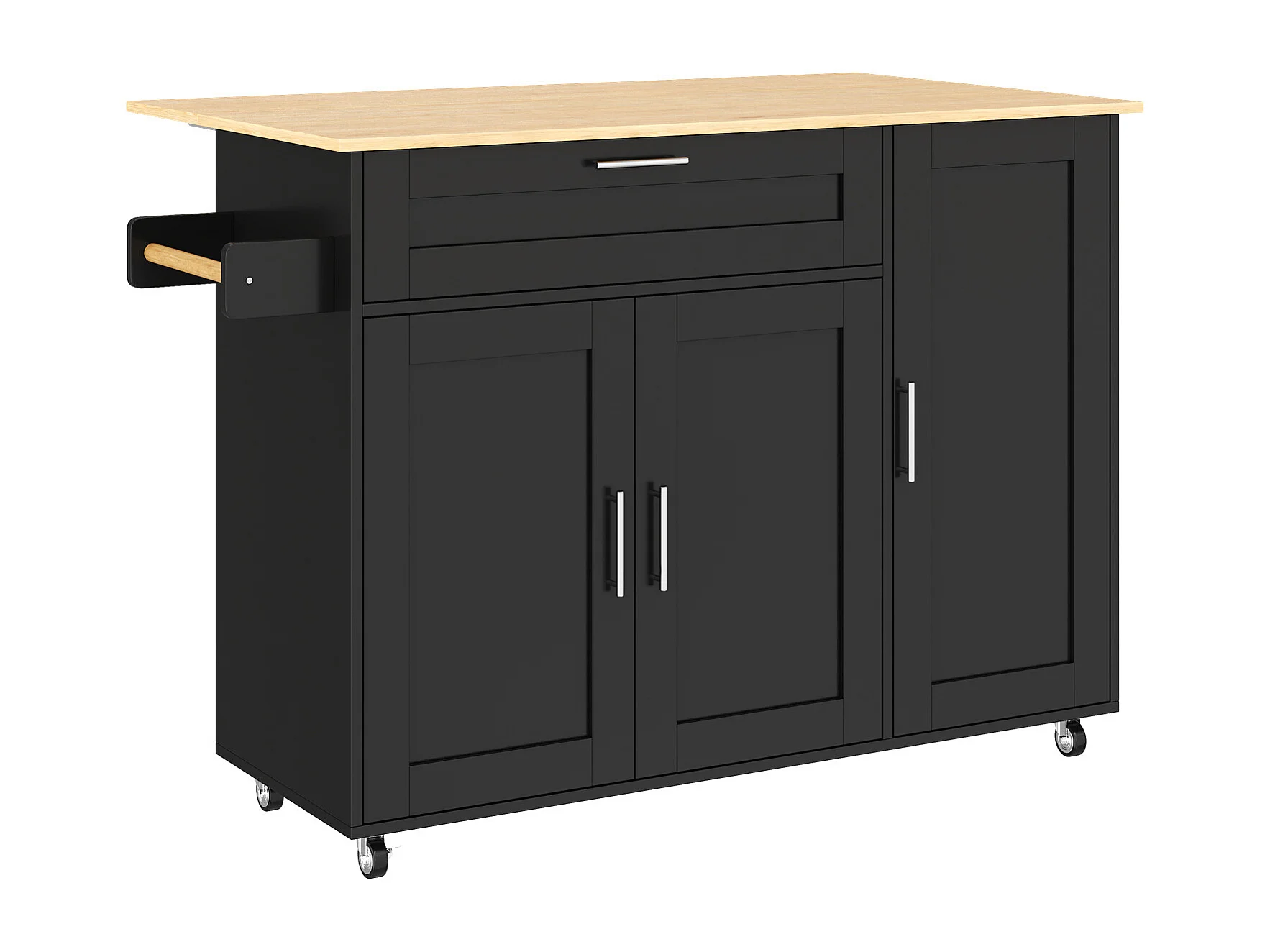 Zwart kookeiland, mobiel kookeiland met uitklapbaar werkblad, 3 deuren en 1 lade - voor keukens en eetkamers