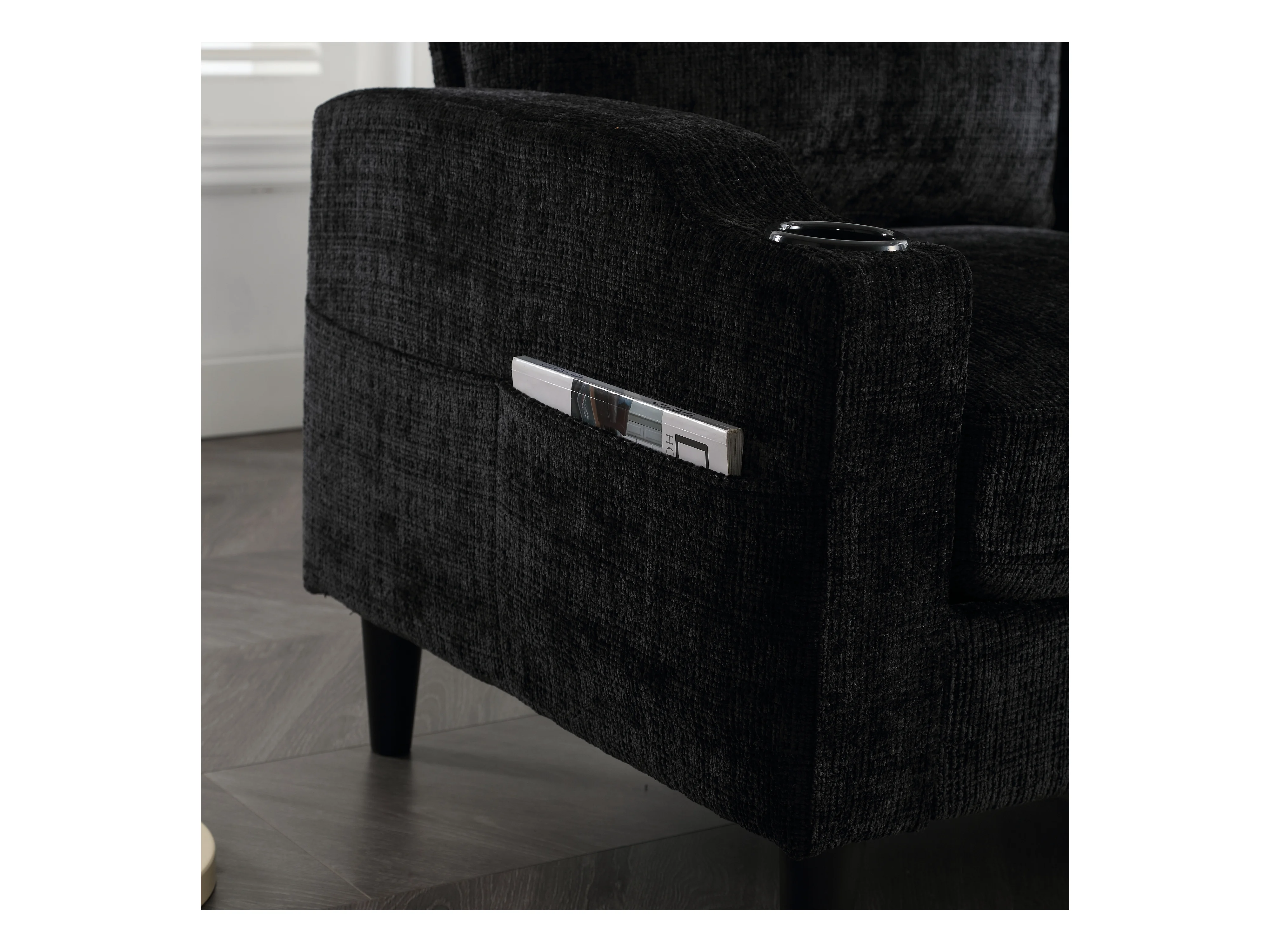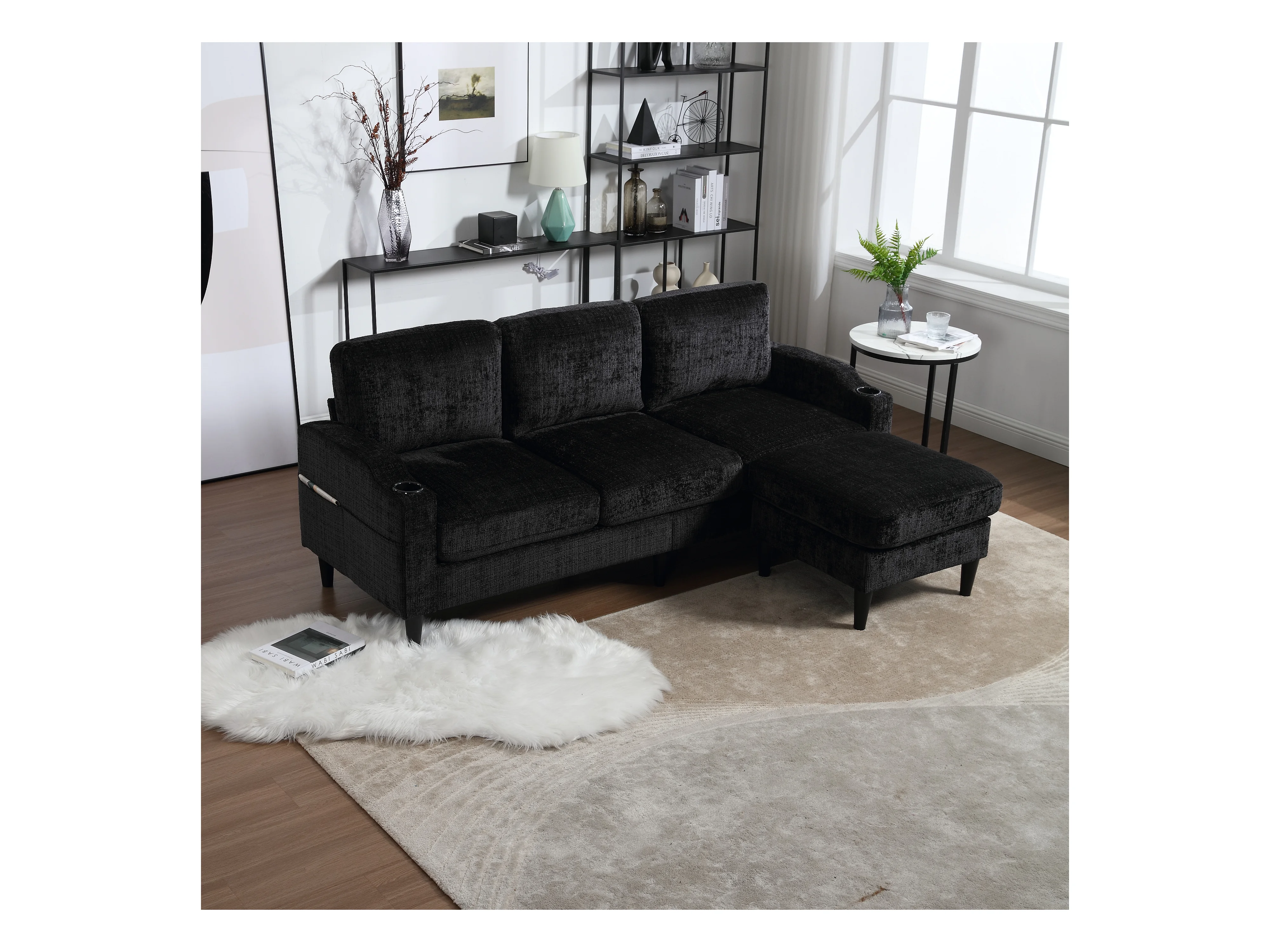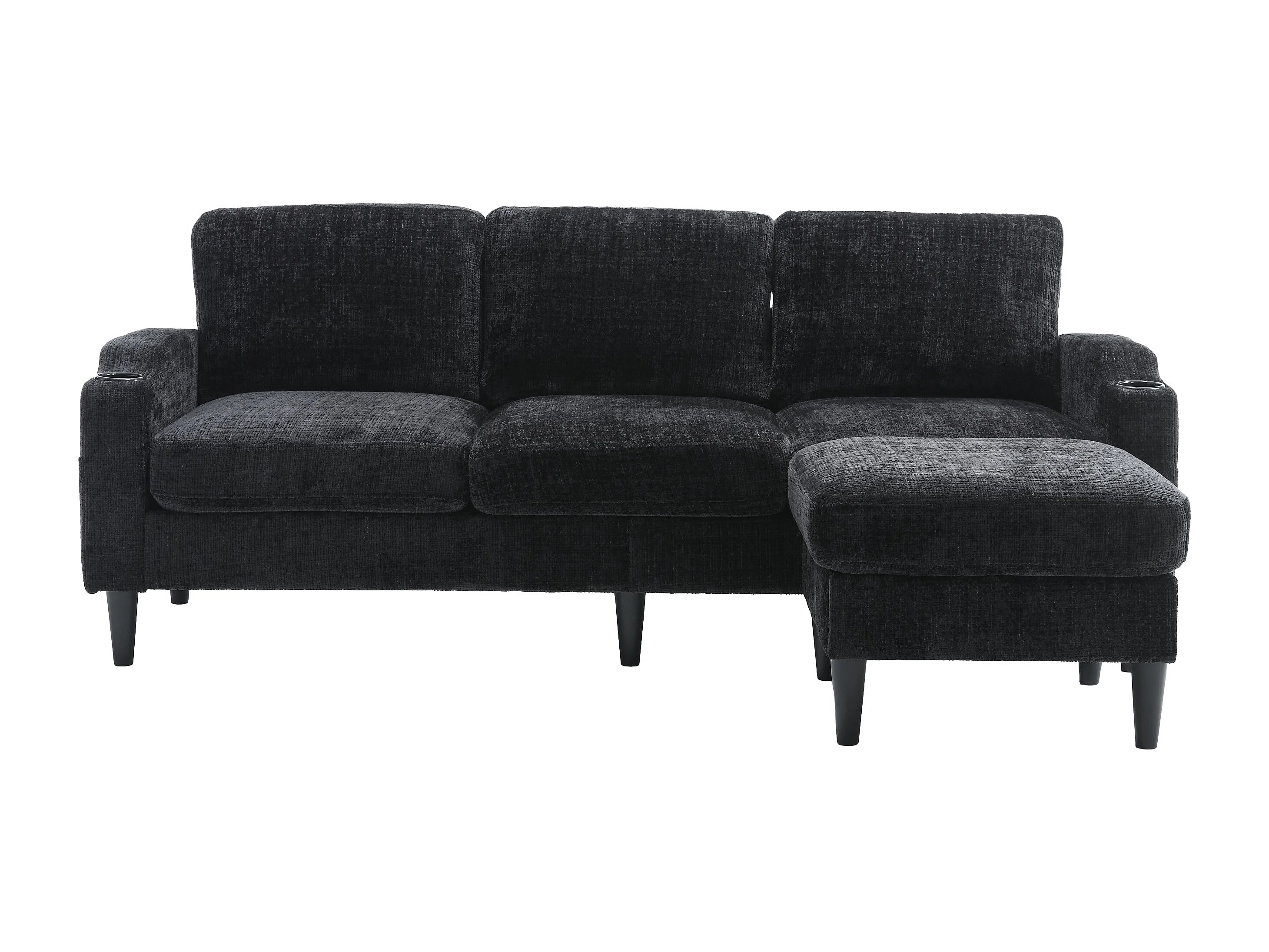 Zwarte 4-zits rechte bank met opbergruimte voetenbank, zijvakken en bekerhouder 196,5 x 75 x 77 cm