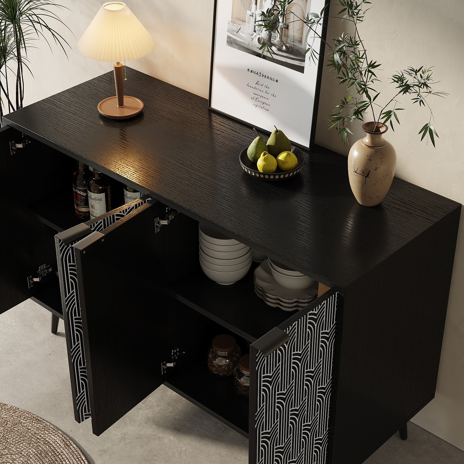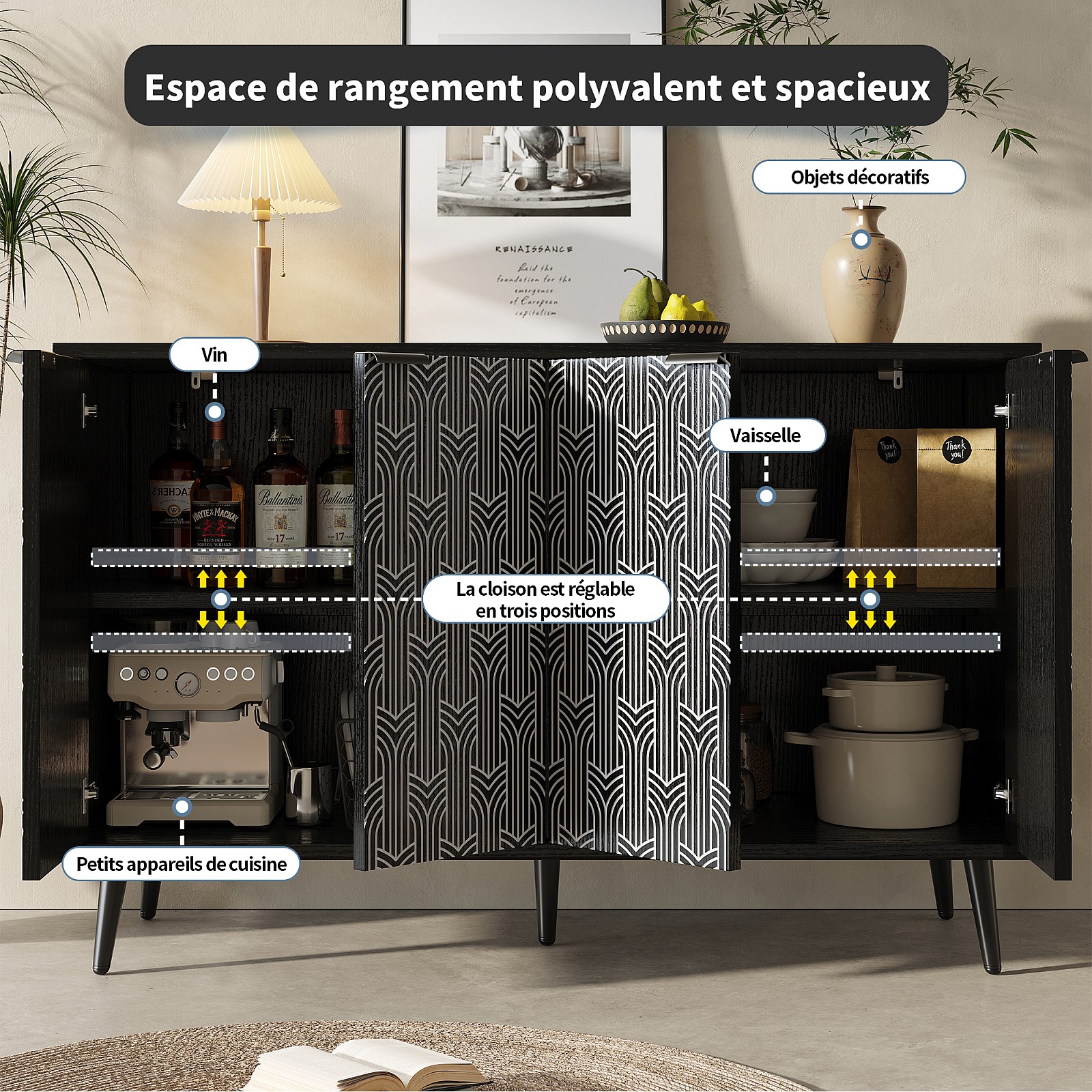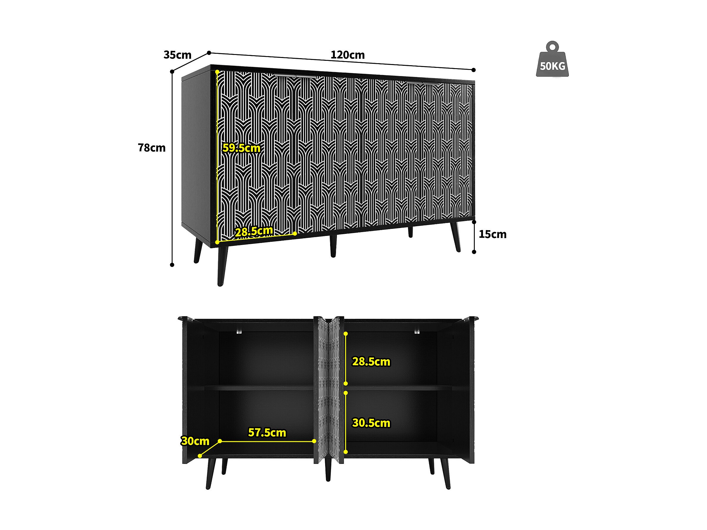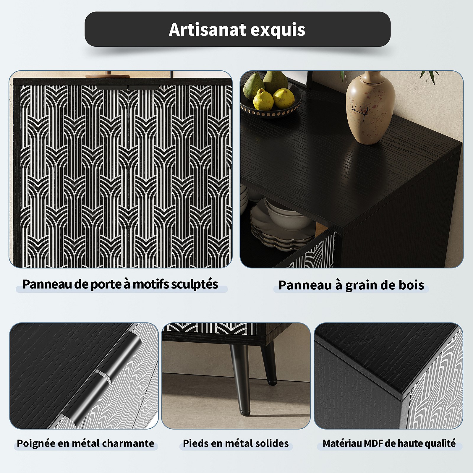 Zwarte dressoir 120x35x78 cm, uniek deurontwerp, gesneden visgraatmotief, anti-kantel, vrijstaand, ideaal voor eetkamer en woonkamer