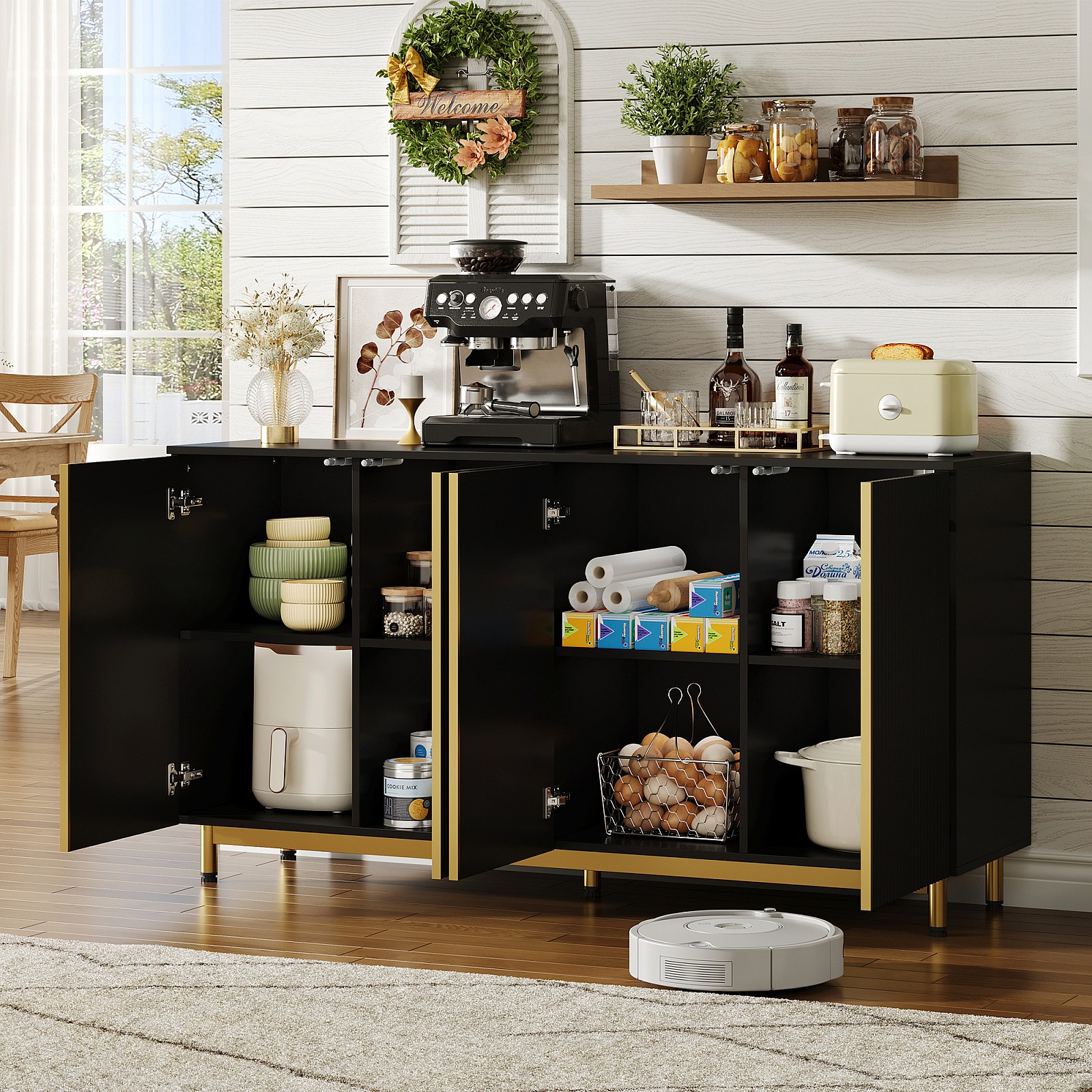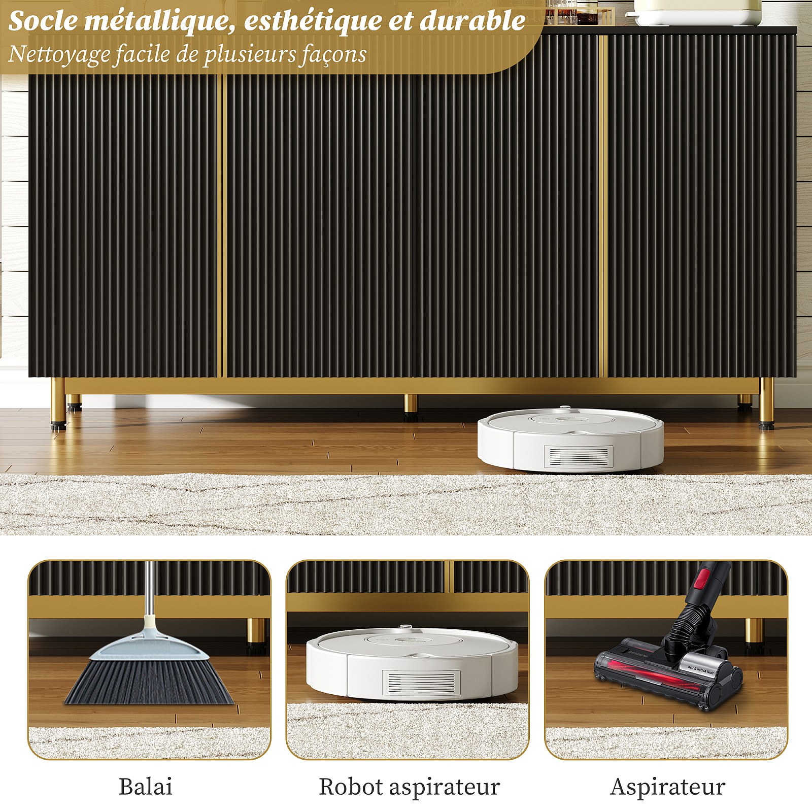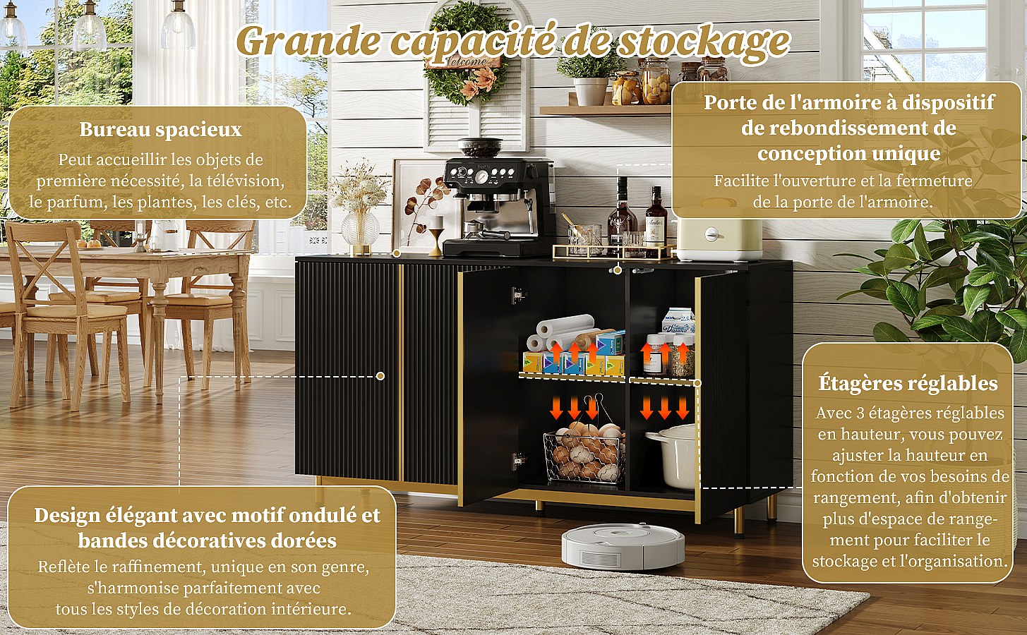 Zwarte dressoir, golvende reliëfdeuren, verstelbare metalen poten, modern design, anti-kantel, ideaal voor eetkamer, keuken en woonkamer