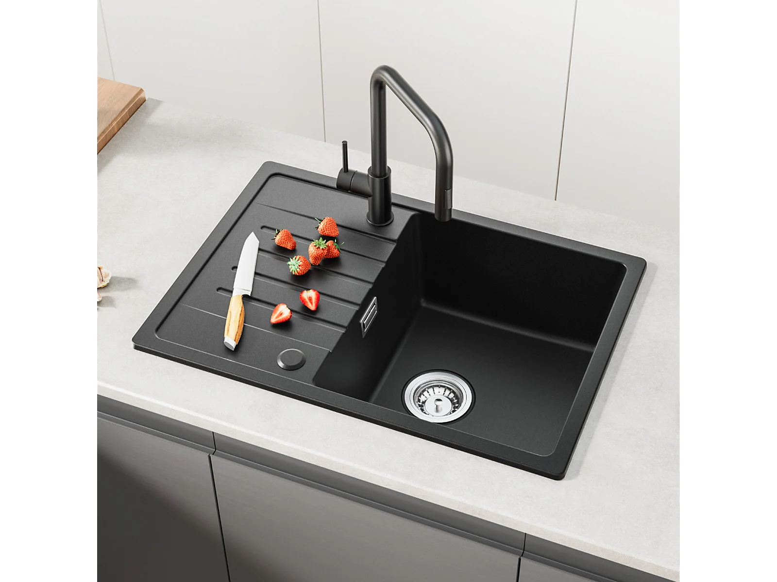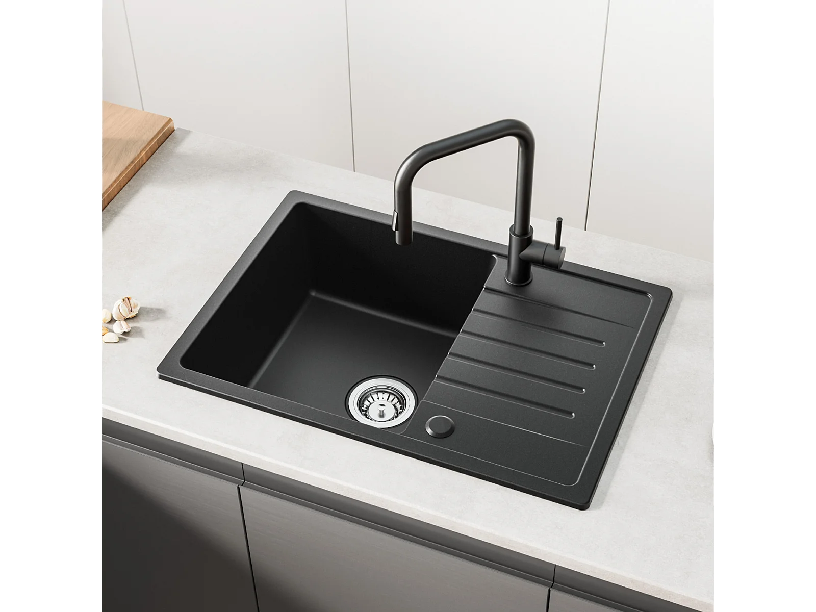 Zwarte inbouwspoelbak met 1 bak en afdruiprek, kwarts en hars, 65x45cm + keukenmengkraan van geborsteld roestvrij staal