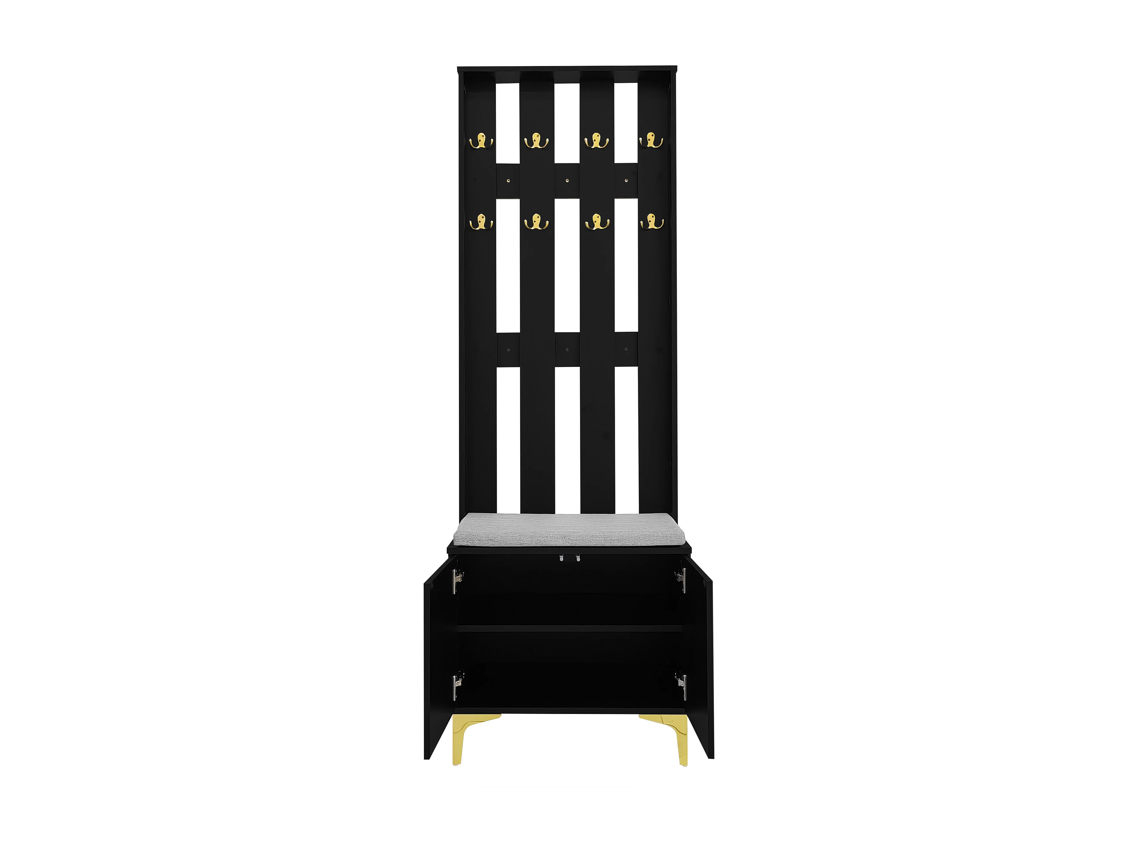 Zwarte kapstok met schoenenbank – golfvormige deuren, gouden haken en verstelbare planken – modern halmeubilair