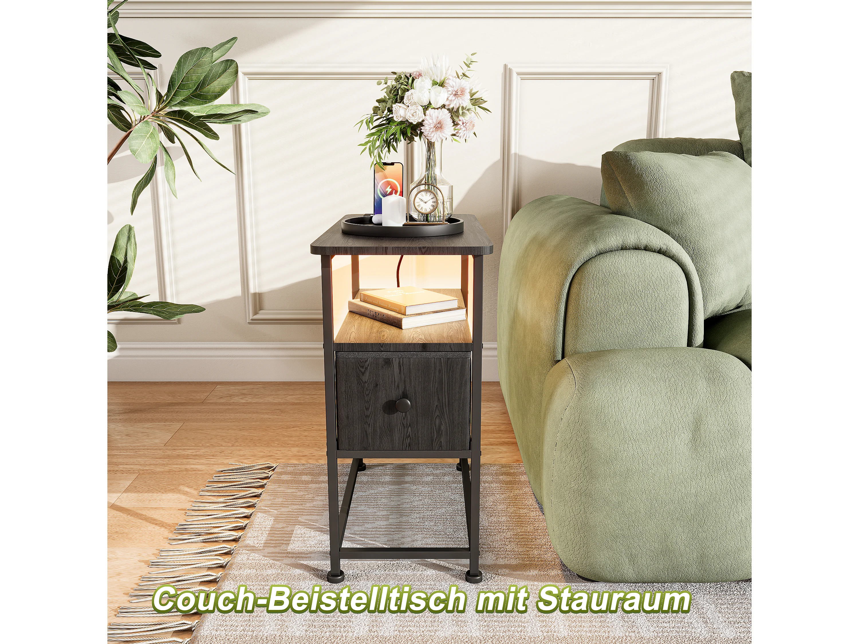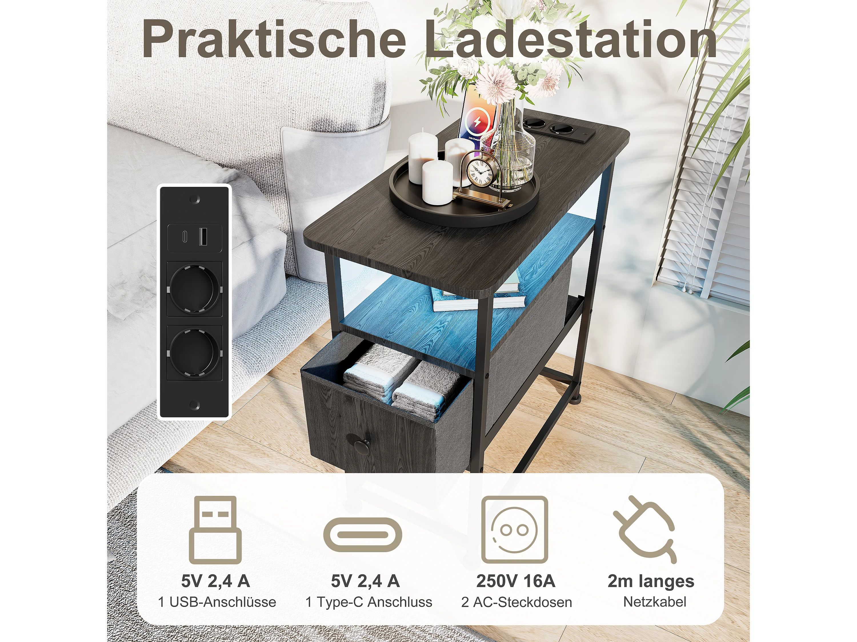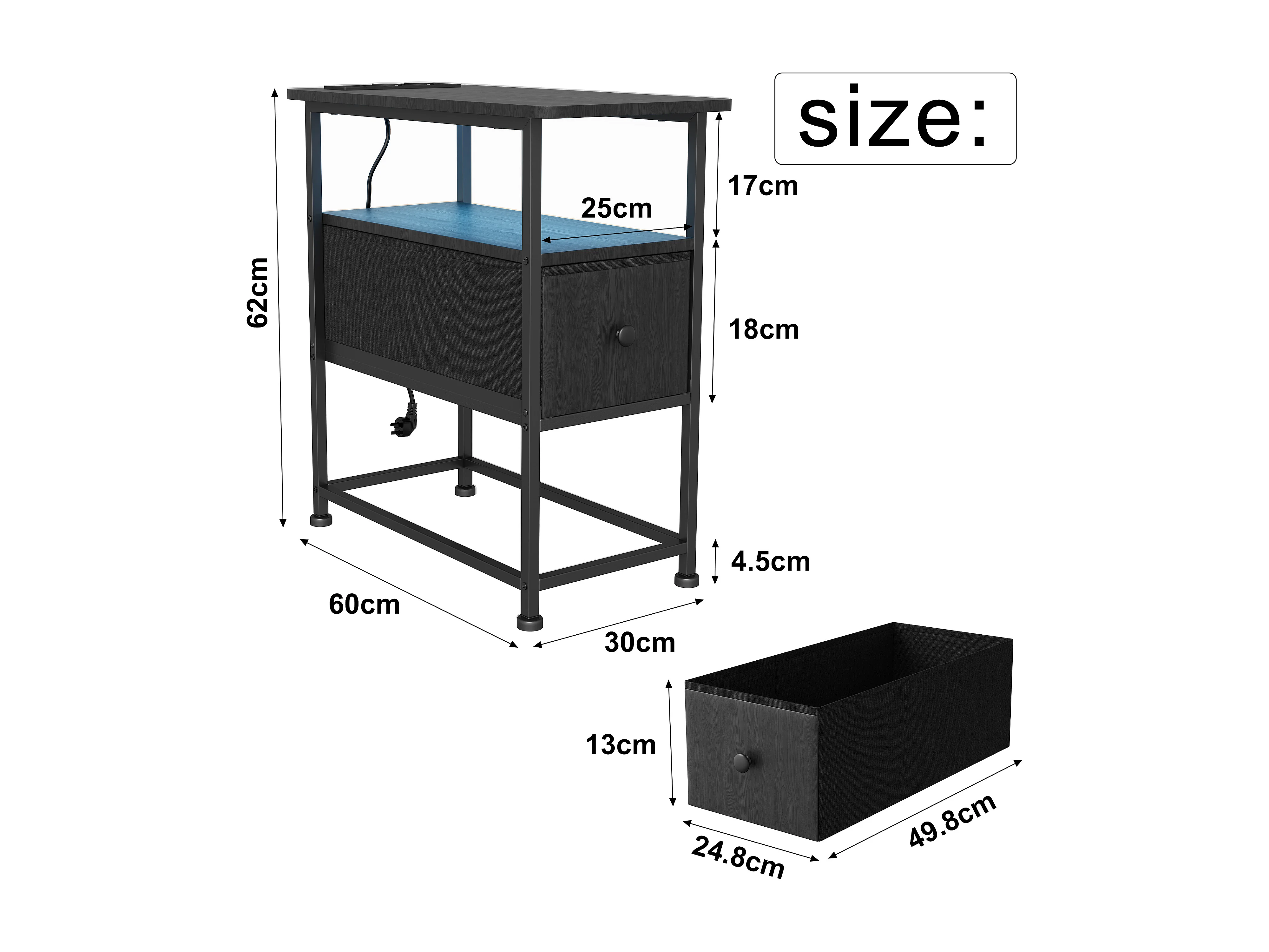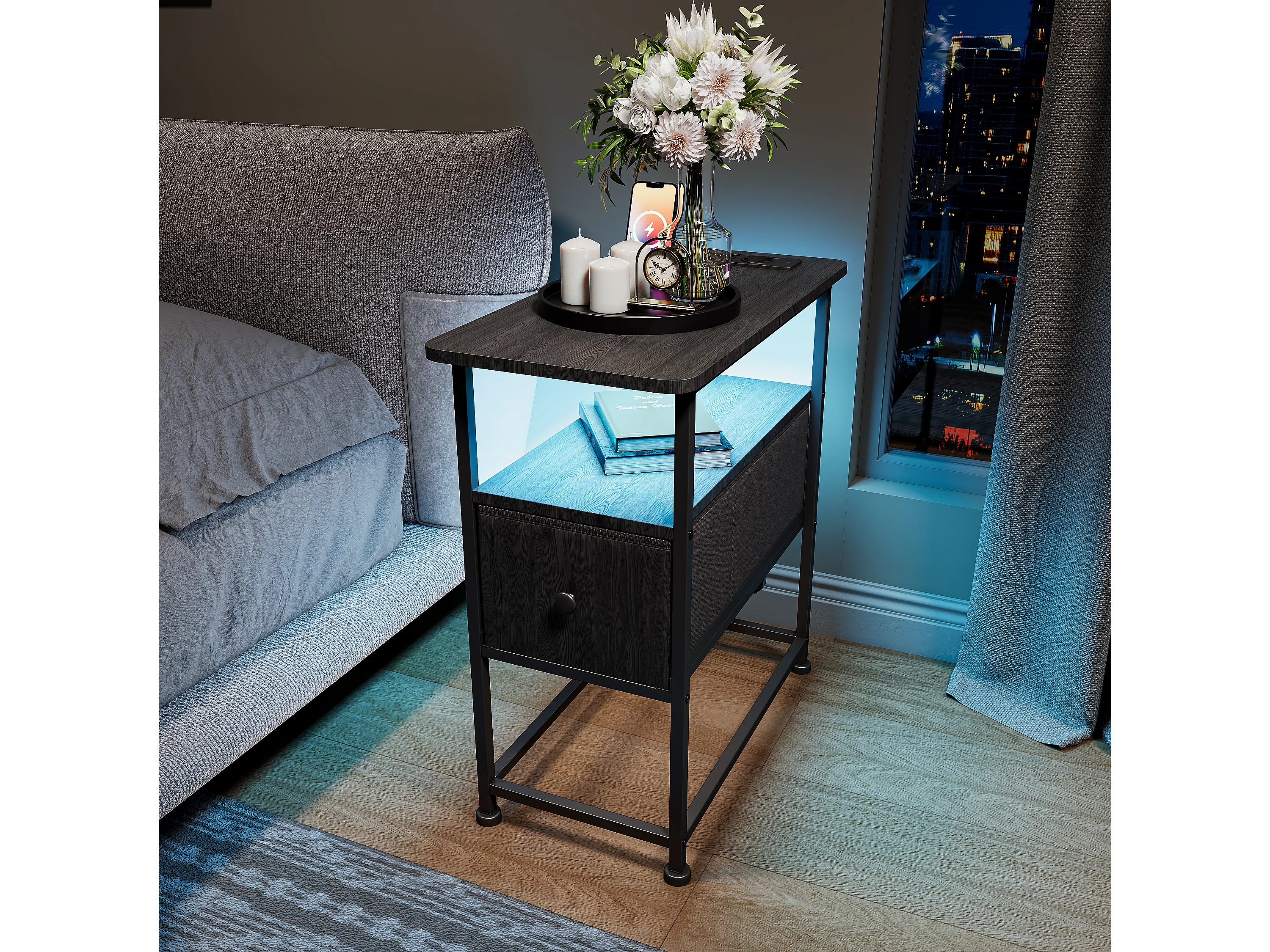 Zwarte LED-bijzettafel met enkele lade en EU-stekker – Modern design, praktische opbergruimte en hightechfuncties