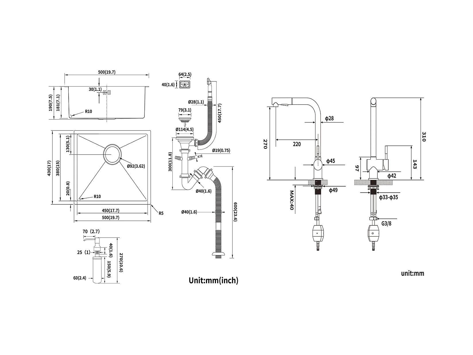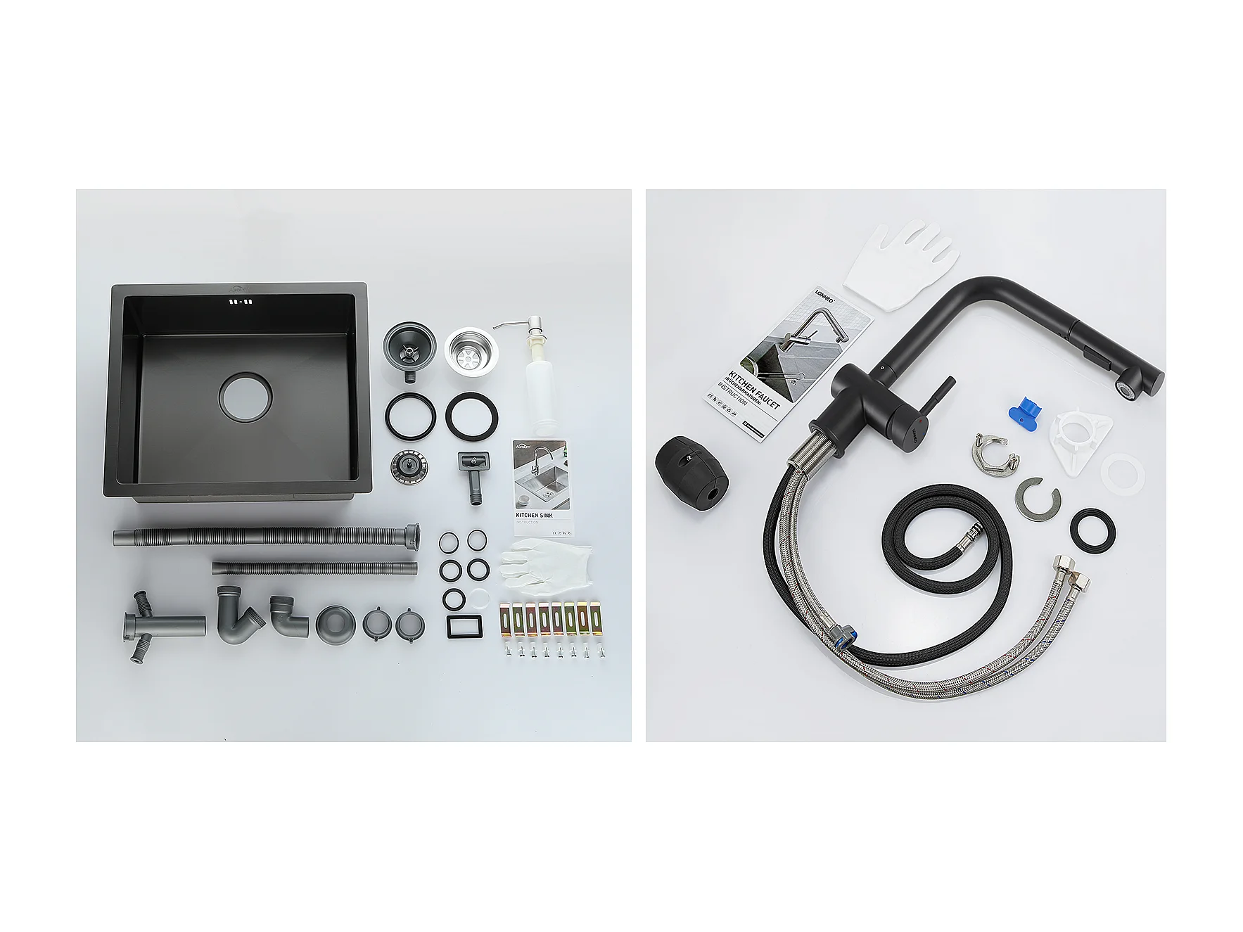 GootsteenZwart 1 Bak 50x43x18,5CM, Roestvrij Staal, met Zeepdistructor + 360° Draaibare Keukenkraan Uittrekbare Handdouche