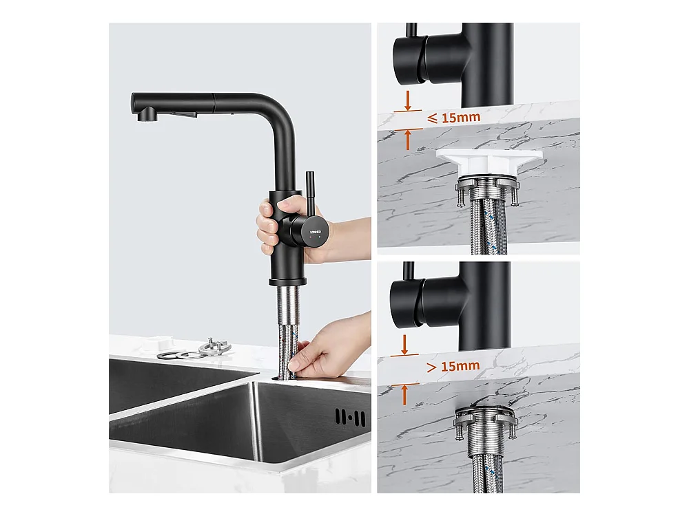 Zwarte gootsteen 1 bak 50x43x18.5CM, roestvrij staal, zeepdistructor + keukenkraan met uittrekbare douchekop 360 °2 Fon