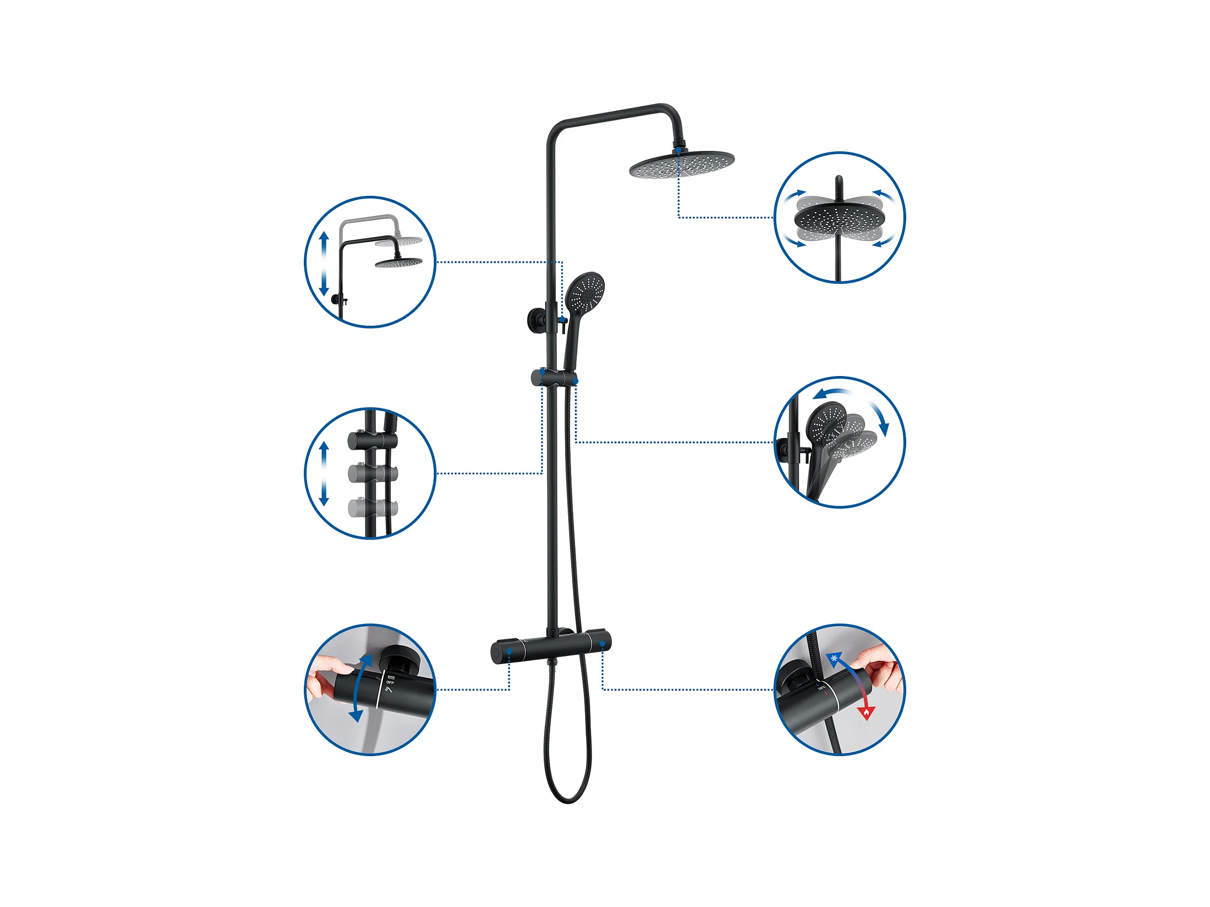 Zwarte thermostatische douchekolom met 38°C thermostatische mengkraan, in hoogte verstelbare douchekolom, douchekop/handkraan 3 stralen